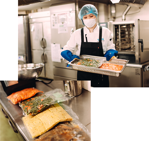 お食事はセントラルキッチンで丁寧に調理後、施設内の厨房で再加熱することで、“できたてのおいしさ”をお楽しみいただけます。