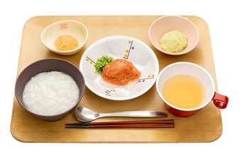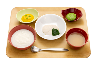 「刻みトロミ」より細かい形状で、「ベース食」をカッターミキサーにかけ、だし汁を加えペースト状にしたものです。離水防止のため、とろみ剤を加えます。主菜は見た目がきれいになるように、ペーストを色分けして盛り付けます。